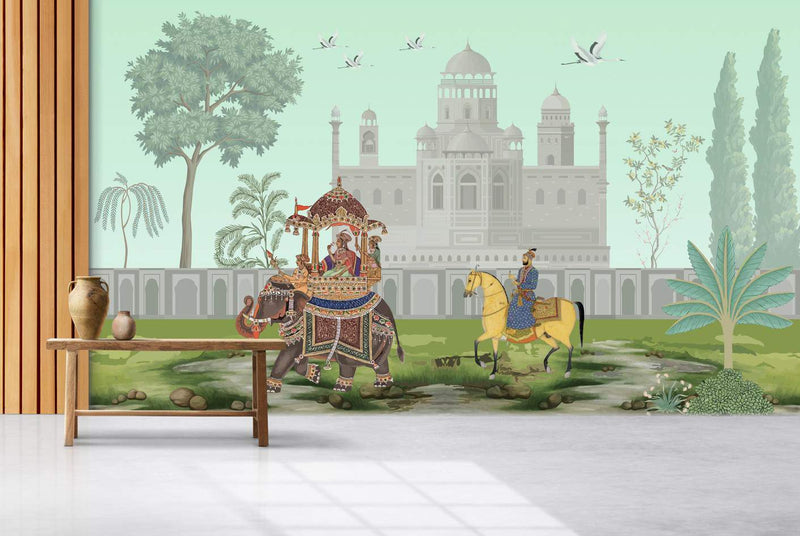 Mughal Majesty Elephant & Horse Procession Wallpaper